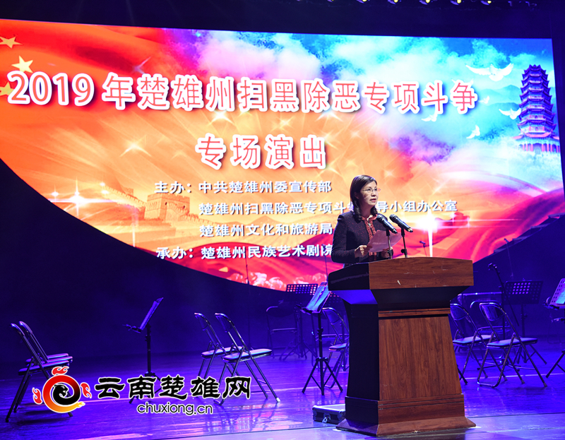4月11日晚,由州委宣传部、州扫黑除恶专项斗争领导小组办公室、州文化和旅游局主办,州民族艺术剧院承办的2019年楚雄州扫黑除恶专项斗争专场文艺演出在彝州大剧院举行。州委书记杨斌要求,要以群众喜闻乐见的文艺演出形式,加强对扫黑除恶专项斗争政策法规的宣传,引导群众树立“扫黑除恶人人有责”的意识,激发全社会积极参与支持扫黑除恶专项斗争的积极性,在全州上下形成对黑恶势力高压严打的社会震慑氛围,为全州扫黑除恶专项斗争向纵深推进提供强有力的舆论支持。