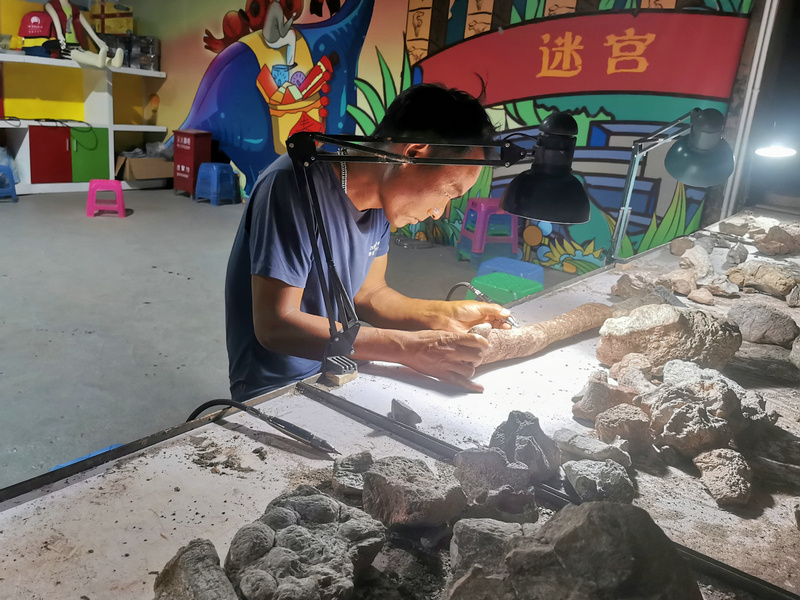 世界恐龙谷展馆内专家正在进行化石修复
