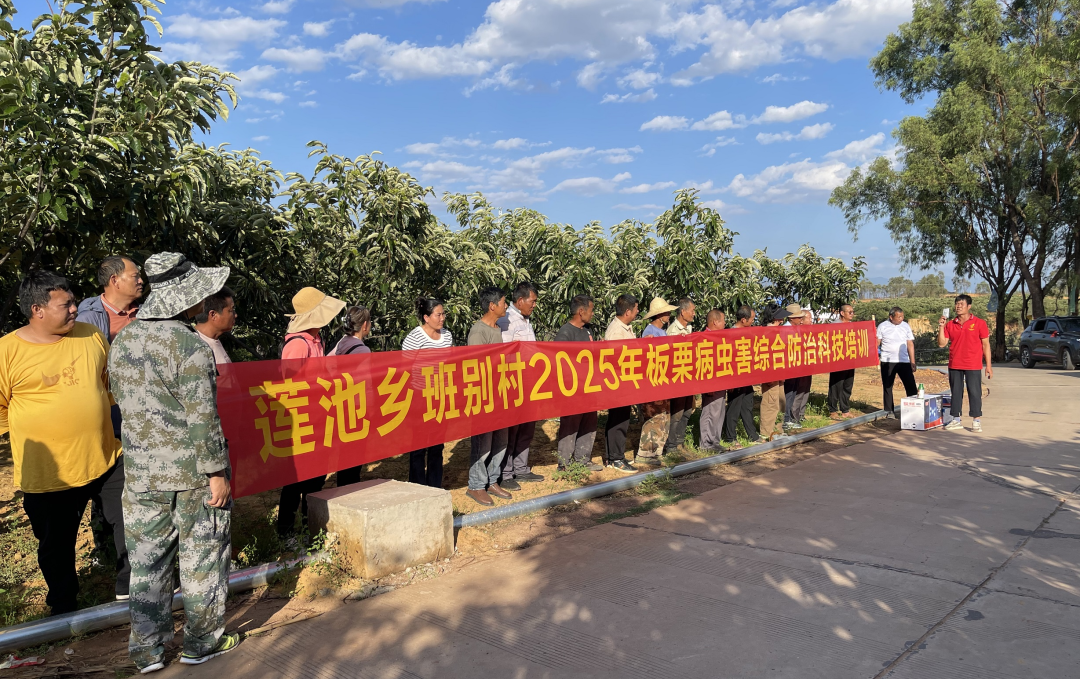 产业要发展,关键在人才。莲池乡始终坚持“走出去学经验、请进来传技术”的策略,为板栗产业持续注入“智力活水”。一方面,组织外出取经拓宽视野,累计选派林果专班、合作社社员及种植大户3批30余人次,前往易门县浦贝乡学习先进种植管理模式;另一方面,邀请迁西、易门等地技术专家及本土“土专家”开展培训6期,发放技术手册490余份,从栗园深耕、树干涂白到剪枝施肥,手把手传授科学种植技术,引入“无人机飞防”等科技防治手段,切实强化农户实操技能;同时,注重本土队伍力量建设,组建15人的专业产业服务队,培育4名本土产业工人,实现“田间有指导、难题有人解”,确保技术服务精准直达一线,支撑产业健康发展。