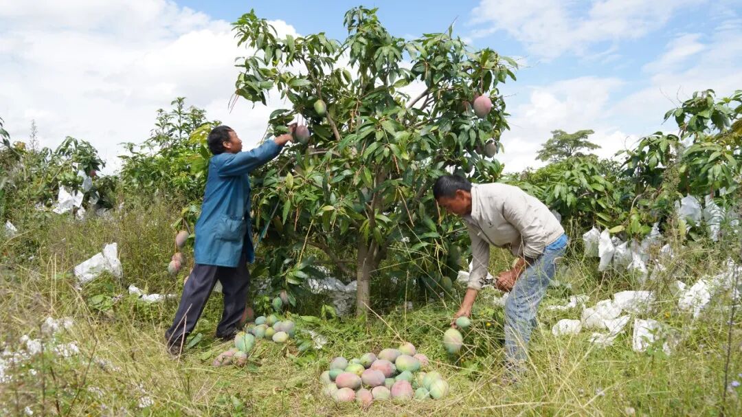 在永定镇建成亚洲单体连片最大的高原晚熟芒果核心示范区的基地里,工人们穿梭在果树间,熟练地采摘、搬运凯特芒果,呈现出一派繁忙的丰收景象。