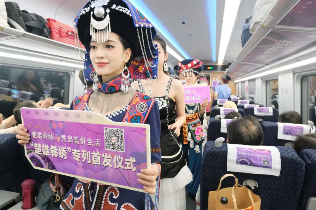 仪式结束后,首批乘客登上专列,瞬间被满满的彝绣元素包裹。过道墙面、行李架底部、椅座头靠上,紫底渐变的绣布上,马缨花纹样如绽放的山花般鲜活,让旅途从视觉开始便浸润着民族风情。列车启程后,车厢内的互动将氛围推向高潮。三弦琴伴奏下,《高山顶上茶花开》《歌唱丰收年》等彝族歌曲深情唱响,空灵的巴乌演奏带来视听盛宴。身着彝绣服饰的模特踏着韵律走秀,工作人员将绣有山茶花的彝绣荷包一一递到游客手中,“这是楚雄手艺人的心意,针脚里藏着最深情的祝福”,简单话语让小小荷包成为连接民族情感的纽带。“刚上车就被行李架上的彝绣标识吸引,舞蹈和走秀更是让我触摸到了民族文化的‘温度’。”成都乘客张晓明感慨,“小伙子的彝绣男装、姑娘的时尚绣裙都特别惊艳,既传统又洋气。”来自北京的付桂荣摩挲着手中的荷包笑称:“本来枯燥的旅途让人犯困,可看到彝绣后瞬间就来了精神,拍了好多照片。以前只在画册上见到,这次能近距离感受还能把‘非遗祝福’带回家,太特别了。”成都乘客周晓艳则直言:“成昆铁路本就是滇川纽带,现在有了彝绣互动,乘车变成了‘移动文化课’,感觉和楚雄的距离一下子近了,下次一定要去楚雄深入了解彝绣。”