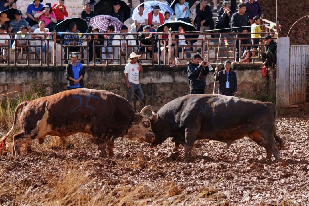 主办方面向武定、禄劝、禄丰、富明等周边地区选拔参赛斗牛,最终按体重分为甲组(700公斤以上)与乙组(700公斤以下),共数十头“斗牛选手”同台竞技。伴随着激昂的音乐,现场气氛火热,斗牛或奋力顶撞、或灵活闪躲,有的刚一碰面便分出胜负,有的则势均力敌、展开“拉锯战”,牛角碰撞的“砰砰”声与观众的欢呼声此起彼伏。比赛间隙,民族舞蹈、互动小游戏轮番登场,让观众在等待中也能感受浓郁的地方文化。