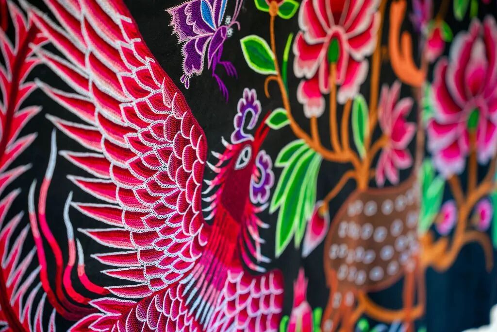 太阳纹、火纹、虎纹、马缨花纹……每一种图案都是一个文化符号,讲述着彝族对自然的崇拜、对祖先的追忆和对美好生活的向往。彝绣被誉为“穿在身上的历史”,其色彩浓烈奔放,以黑为贵、红为祥、黄为美,构图饱满,寓意深刻。