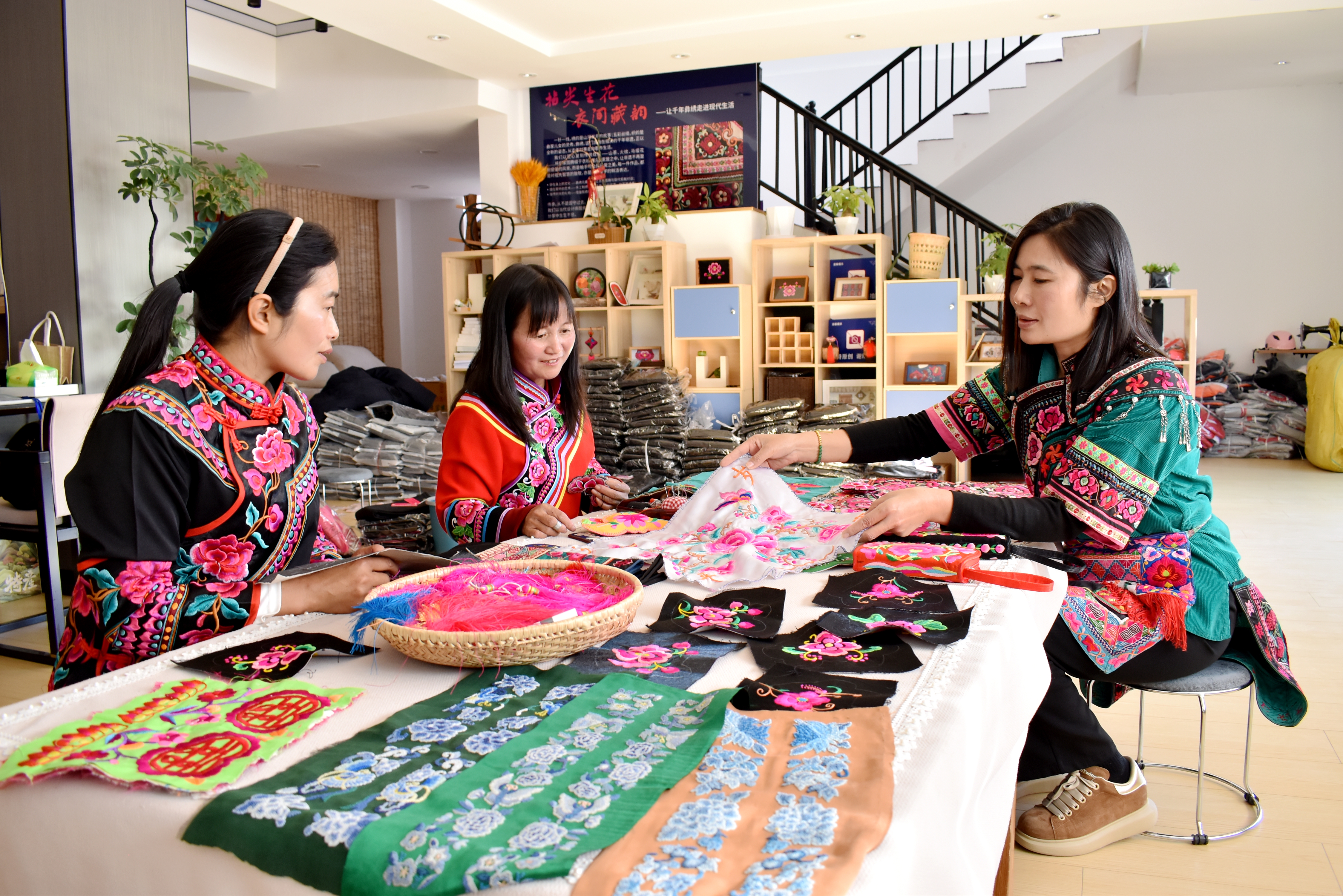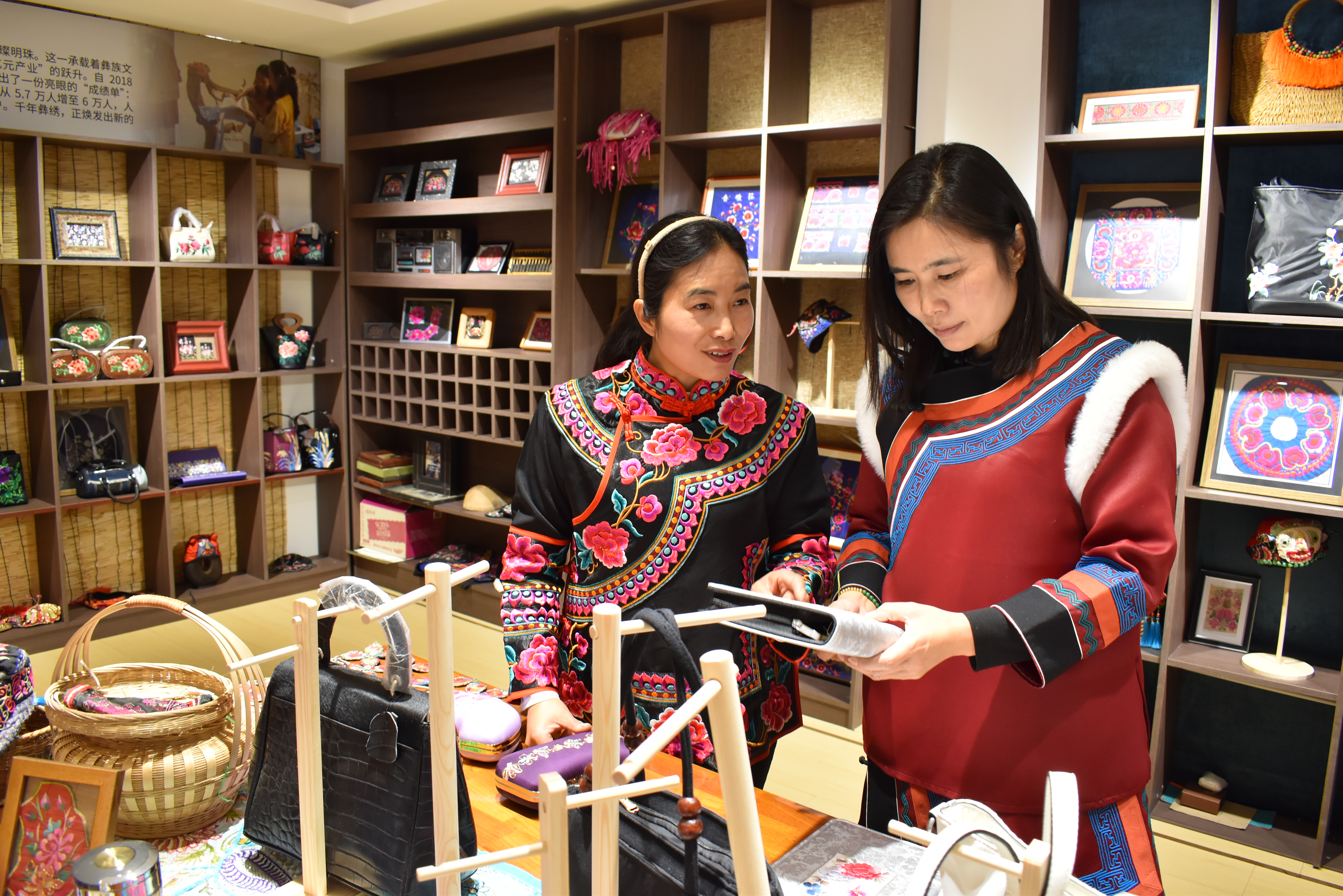 “我从小就喜欢缝针线,长大后开一个彝绣店,是我的梦想,这个梦想实现了!”接着一个个买香包、表演服的订货电话,看着客商在挑选一件件彝绣产品,李彩云自豪地说。