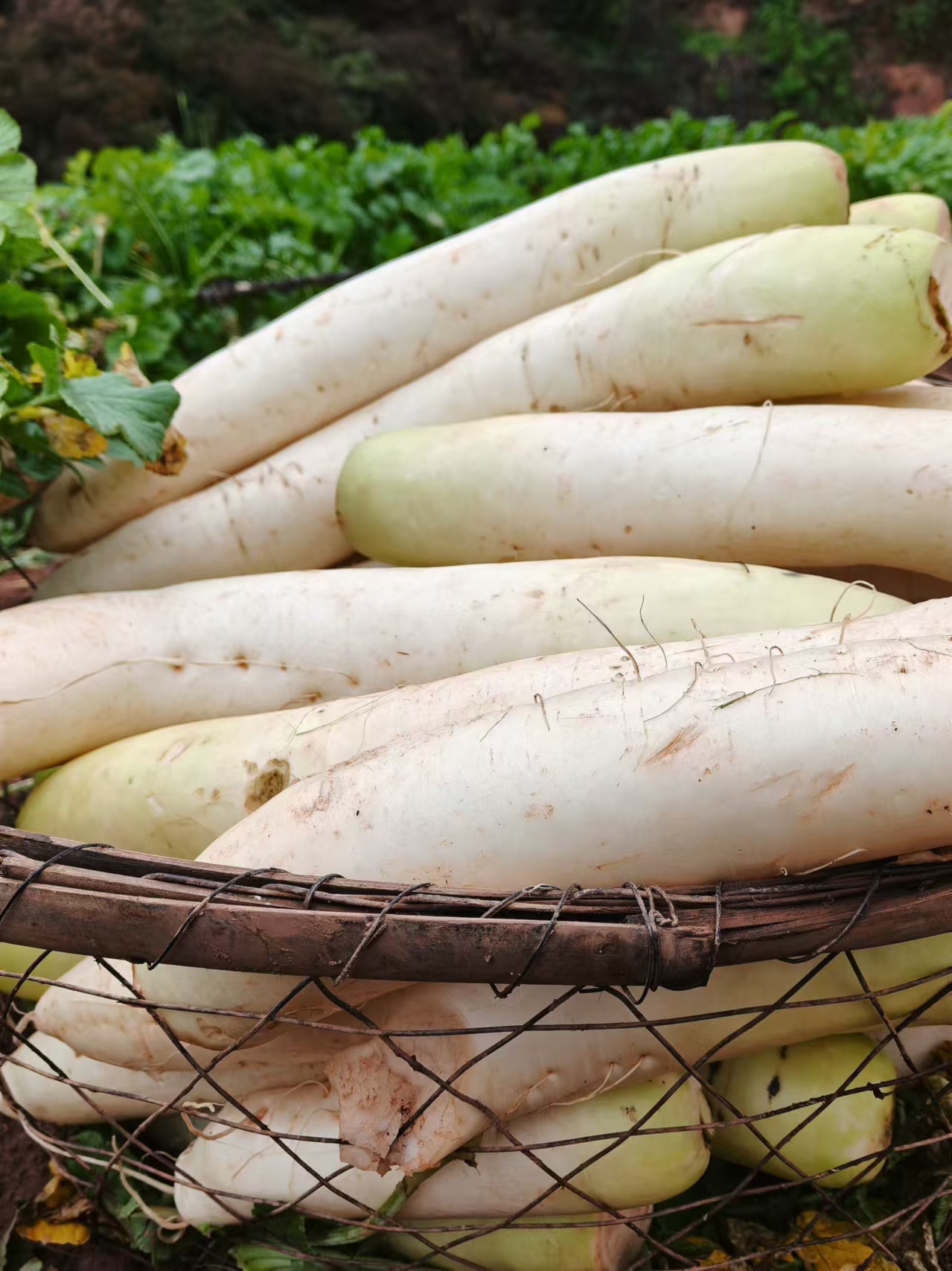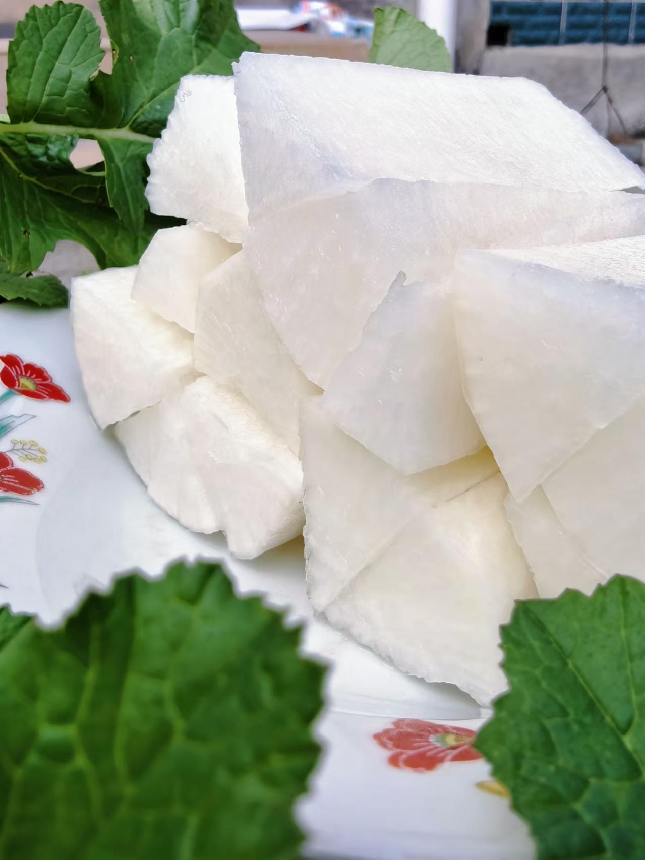 沙桥萝卜的独特风味,藏在高原的天地馈赠里。这里低纬度高海拔,四个月的霜期让萝卜在低温中沉淀糖分、浓缩营养,沙壤土的湿润透气更让其肉质饱满多汁。剥开带着泥土气息的外皮,雪白的果肉清香扑鼻,咬一口“嘎嘣”脆响,甘甜汁水瞬间充盈口腔,全无普通萝卜的辛辣,清脆爽口,难怪当地人直呼“生吃赛鸭梨”。这份天然鲜甜,源自大自然的精妙调配,也契合了中医“秋冬养阴”的养生之道——冬季人体外冷内热,易积郁热,而萝卜性凉味辛甘,入心、肺、胃经,能清热润燥、消食化积,恰如天然的“养阴食材”,让“萝卜就热茶,气的大夫满街爬”的俗语有了科学注解。