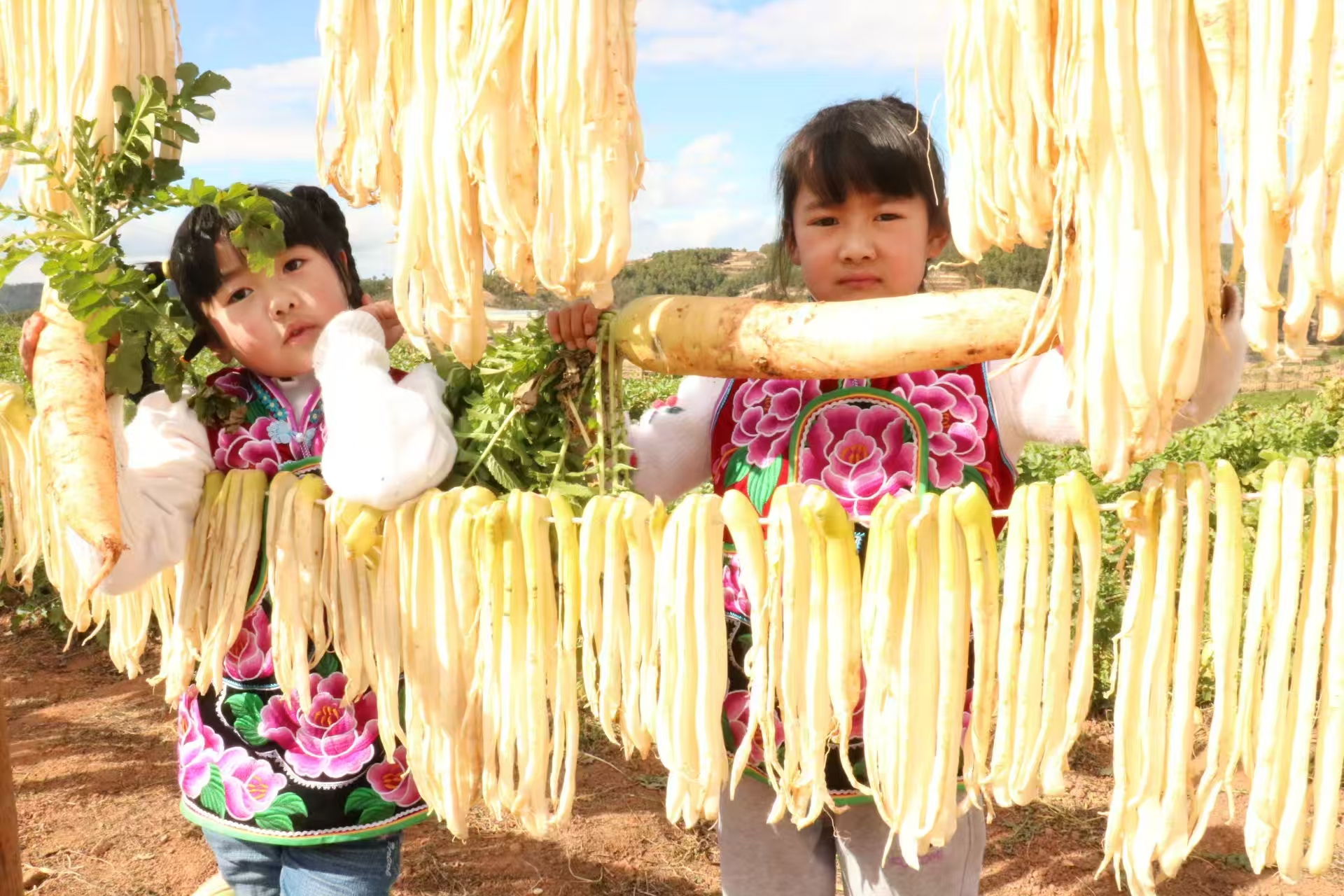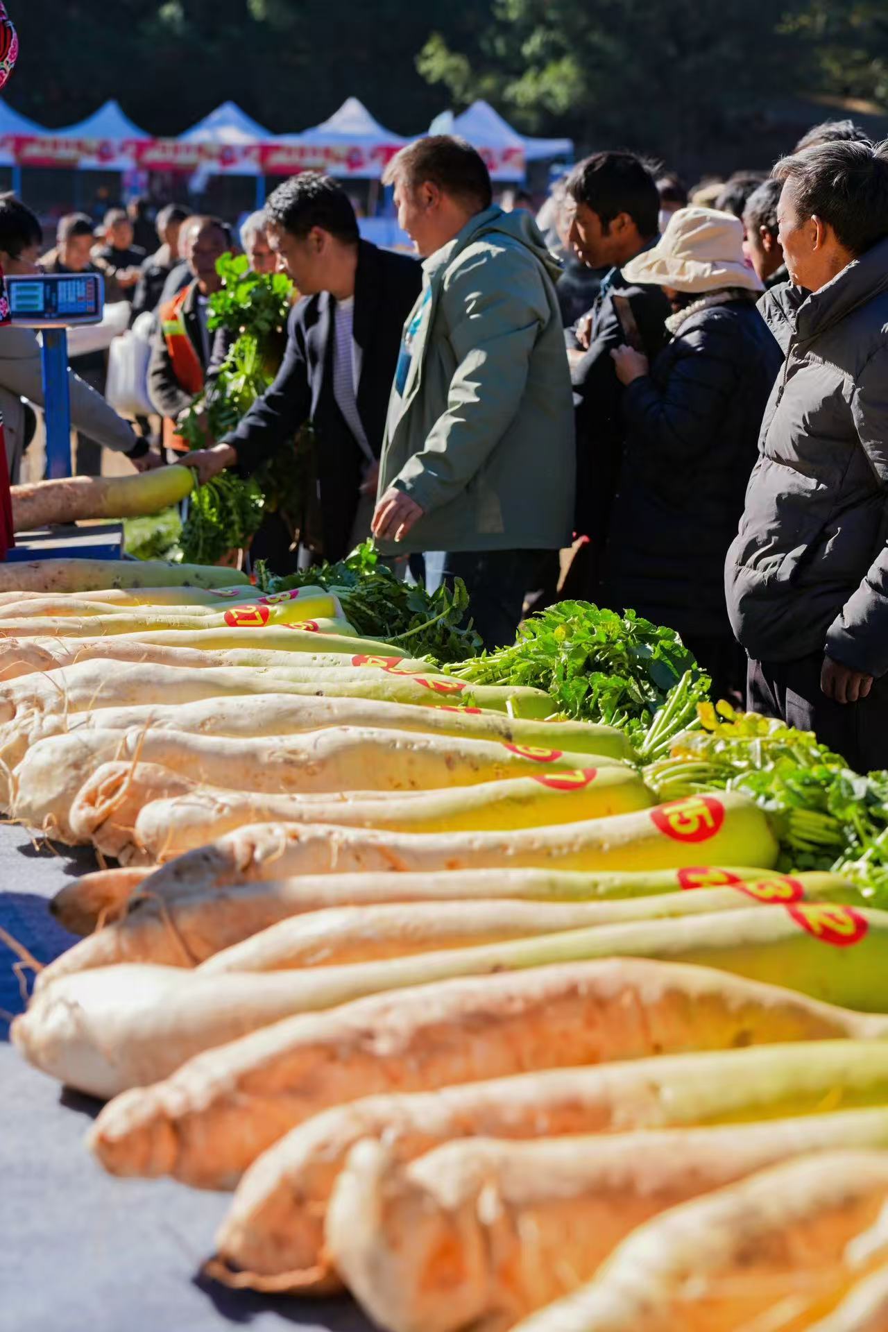 如今的沙桥萝卜,早已不是田间地头的普通蔬菜,而是承载着乡亲们致富梦想的“金疙瘩”。从20世纪90年代路边摆摊售卖的本地品种,到如今通过“企业+合作社+农户”模式规模化种植,沙桥镇已发展出4万余亩萝卜基地,年产量达40万吨,年产值突破3亿元。省农科院的技术支持让品种不断优化,“亚美白春”等优质品种亩产翻倍,无公害认证让品质有了保障;标准化加工厂让萝卜变身萝卜条、风干块等深加工产品,电商直播让这颗高原萝卜直达广州、深圳的餐桌,甚至漂洋过海销往韩国、日本。连续八届萝卜文化艺术节上,拔萝卜比赛、“萝卜王”评选与彝族三弦舞相映成趣,推出的“萝卜宴”成为游客必体验的特色,让农旅融合的道路越走越宽。