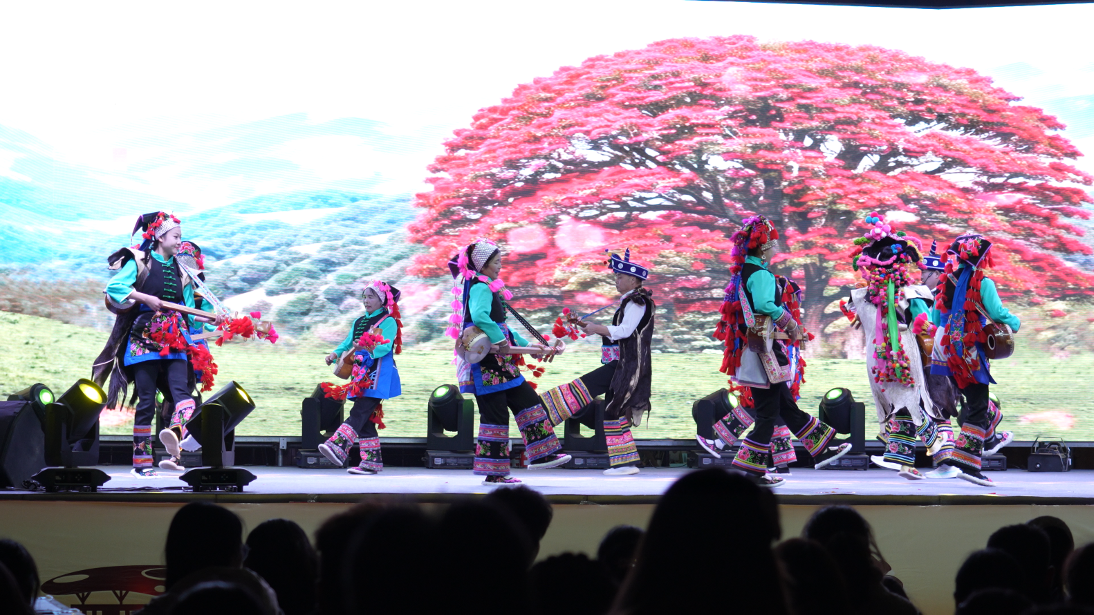 本次演出以本土群众为主,精心编排了一台涵盖歌舞、器乐、非遗展示的综合性文艺节目。演出以展现时代气象的开场舞《金马盛世展新颜》拉开序幕,随后,婉约的旗袍秀《天下最美花舞人间》、深情的女声独唱《母亲是中华》、充满童趣的舞蹈《春戏》、展现国家级非遗彝族刺绣技艺的女子群舞《十指生花》、洋溢着幸福感的老年舞蹈《彝家欢歌》、激昂的二胡独奏《战马奔腾》以及融合时尚与民族风的现代舞《爵·响》与《佤·印》等节目轮番上演,精彩纷呈。
