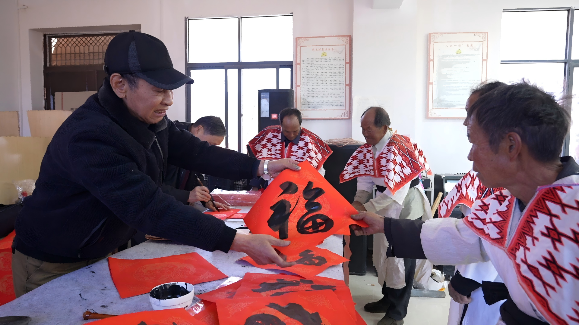 球场旁的活动室里,几张长桌一字排开,红纸翻飞、墨香四溢。武定县书法爱好者泼墨挥毫,为村民义务书写春联。一副副融入马年美好祝愿的春联刚刚写就,便被守候多时的村民取走。