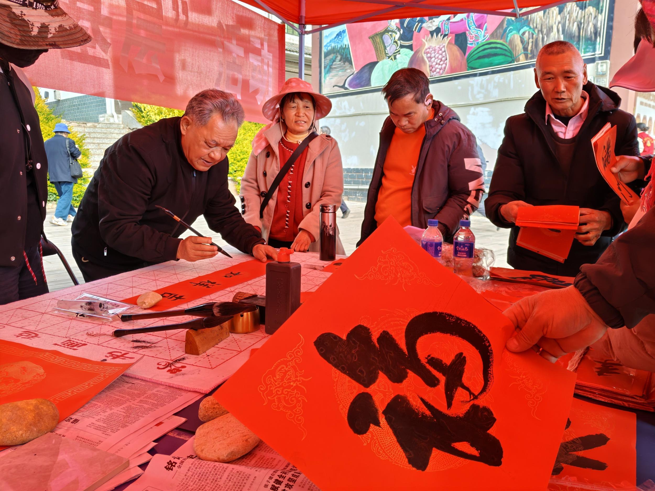 “福满家门添喜气,春临戌街启新程”。忠兴村广场上,笔墨飘香、暖意融融。云南省老干部书画协会、楚雄州老年大学的银发书法家们摆开长桌,为村民免费书写春联和“福”字。71岁的云南省老干部书画协会副会长张佩琛笔力遒劲,短短几分钟就完成了一副寓意吉祥的春联,引得村民们争相排队等候。“这副春联写得好,有墨香有年味。”接过刚晾干的春联,村民金大姐笑得合不拢嘴。活动现场,志愿者共书写发放春联400余副、“福”字百余个,红红的春联、浓浓的墨香,将新春的祝福送到了戌街乡的村村寨寨,让传统文化在基层落地生根。