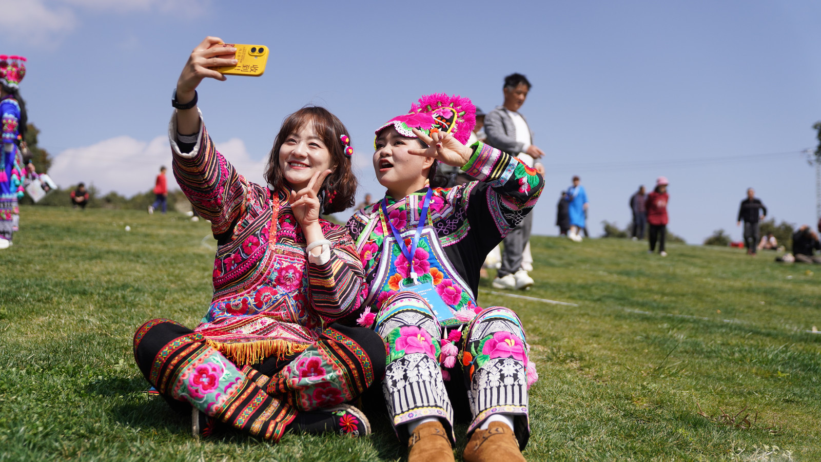 景区另一侧的“方山雅韵·非遗集趣”新春非遗市集里,苴却砚、彝绣、传统乐器、民族服饰集中亮相,多件珍贵老绣片引得人们驻足细看。最热闹的要数“智慧擂台”趣味问答区,彝语学习、绣品识别、非遗知识问答等任务前围满了参与的群众,完成集章就能兑换刺绣挎包、香包、钱夹等文创礼品。来自县城的金女士拿着刚换到的刺绣香包说:“又好玩又长知识,很有意思。”打卡墙、签名留言墙前,各族群众争相留影,记录下赛装活动的欢乐瞬间。