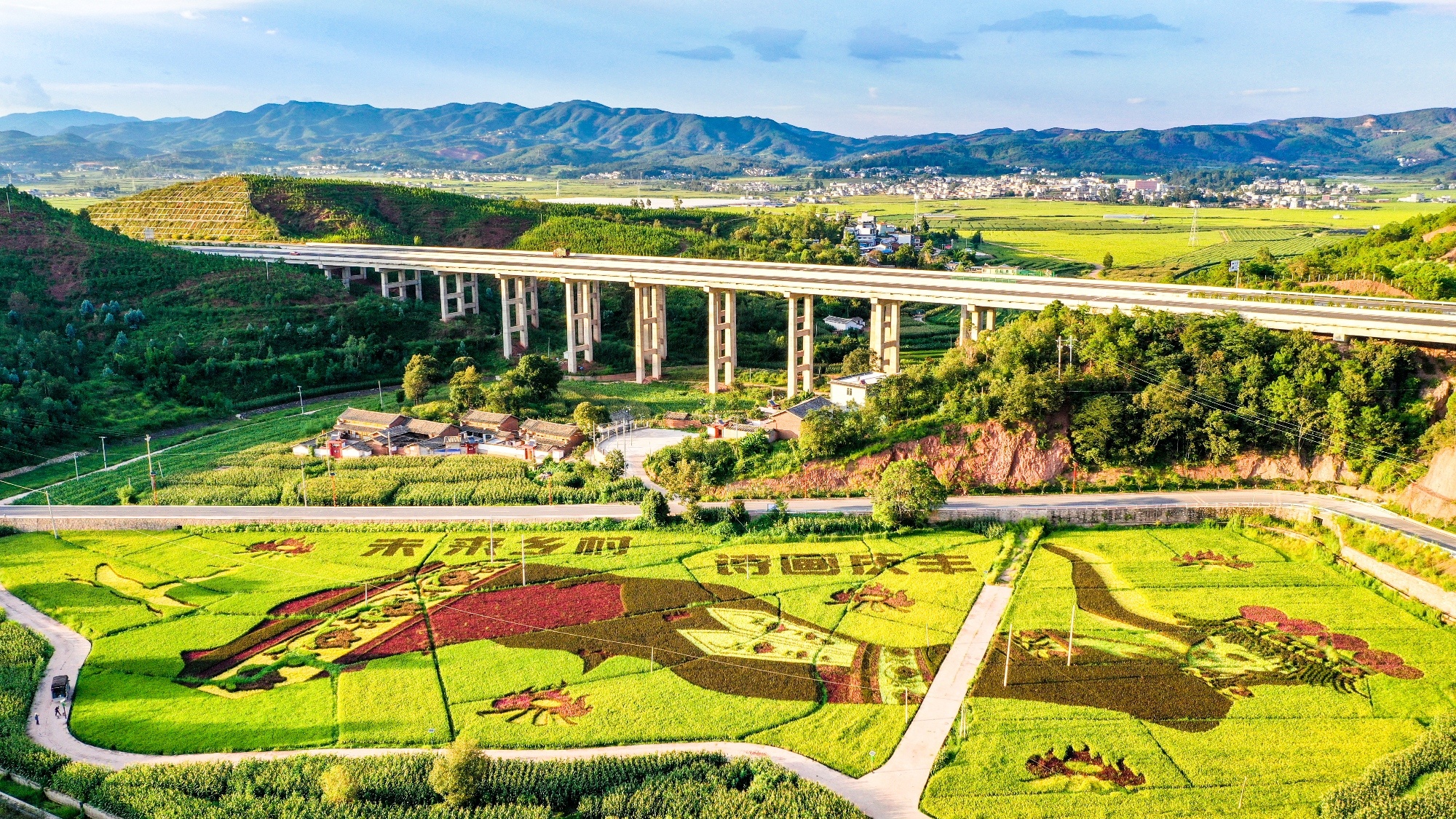 红辣椒一串串挂在土墙、竹竿上,像一束束跳动的火焰,映得一面面土墙泛着暖意。金黄的玉米被剥去外衣,一串串挂在村里的围栏、院墙上;脱粒后的玉米粒和稻谷饱满地摊在小院的水泥地板上,阳光一照,仿佛撒了一地碎金。南瓜整齐地堆放在屋檐下,还有那紫黑的豇豆、褐黄的柿饼、青灰的菌菇……各种食材在秋阳下静静呼吸,将水分一点点交给风与光,把味道浓缩成冬日的记忆。