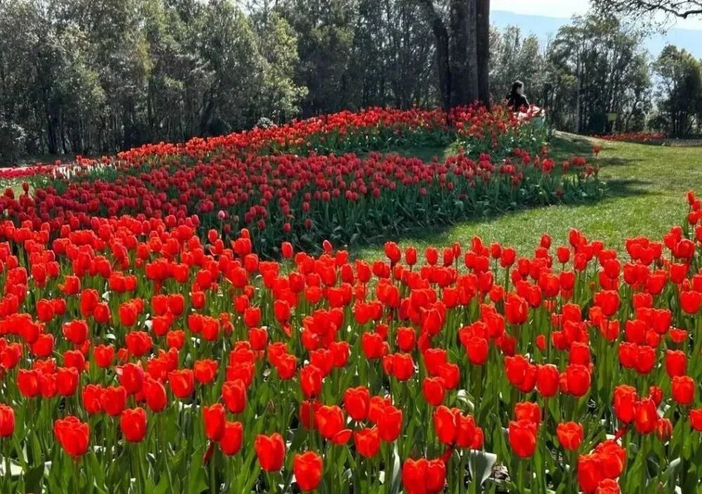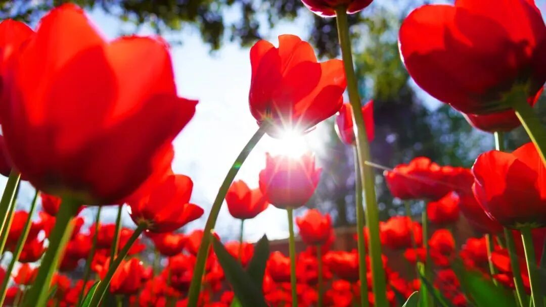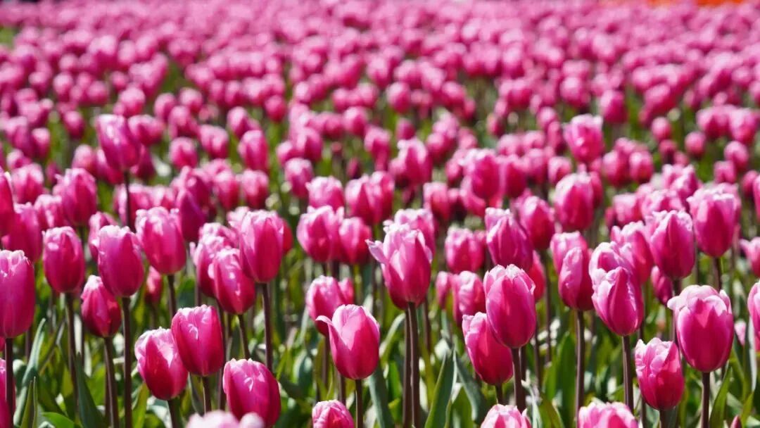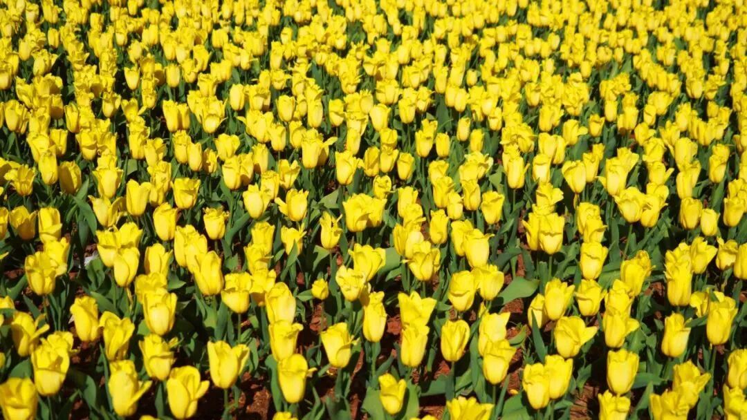 漫山遍野的郁金香开得恣意张扬,热烈的春日气息扑面而来,好像在举行一场盛大的春日狂欢。