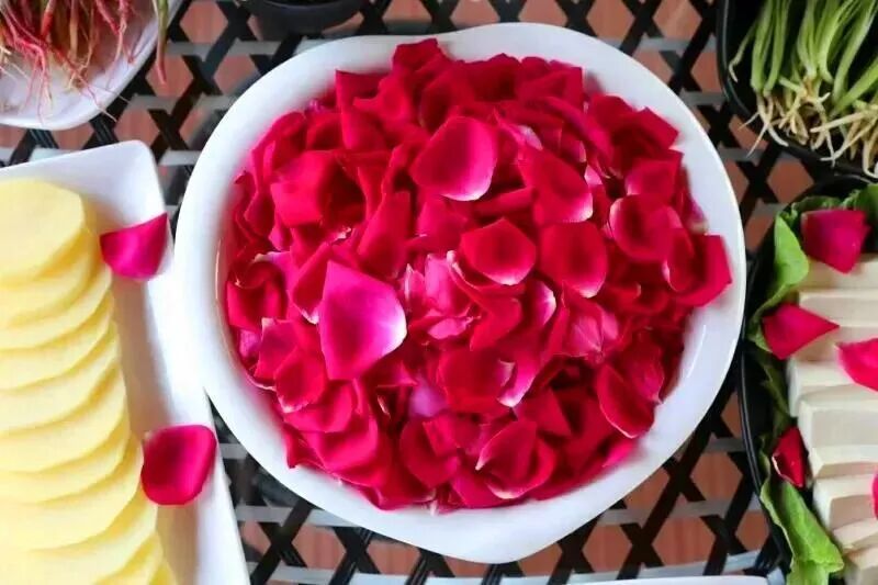 玫瑰在楚雄也是食用非常广泛的花,常被制成点心或甜品,如鲜花饼、玫瑰酱、玫瑰酒、玫瑰花饮等,也可与蔬菜和肉类搭配,或做一桌玫瑰花宴,或煮玫瑰火锅,好吃又浪漫。