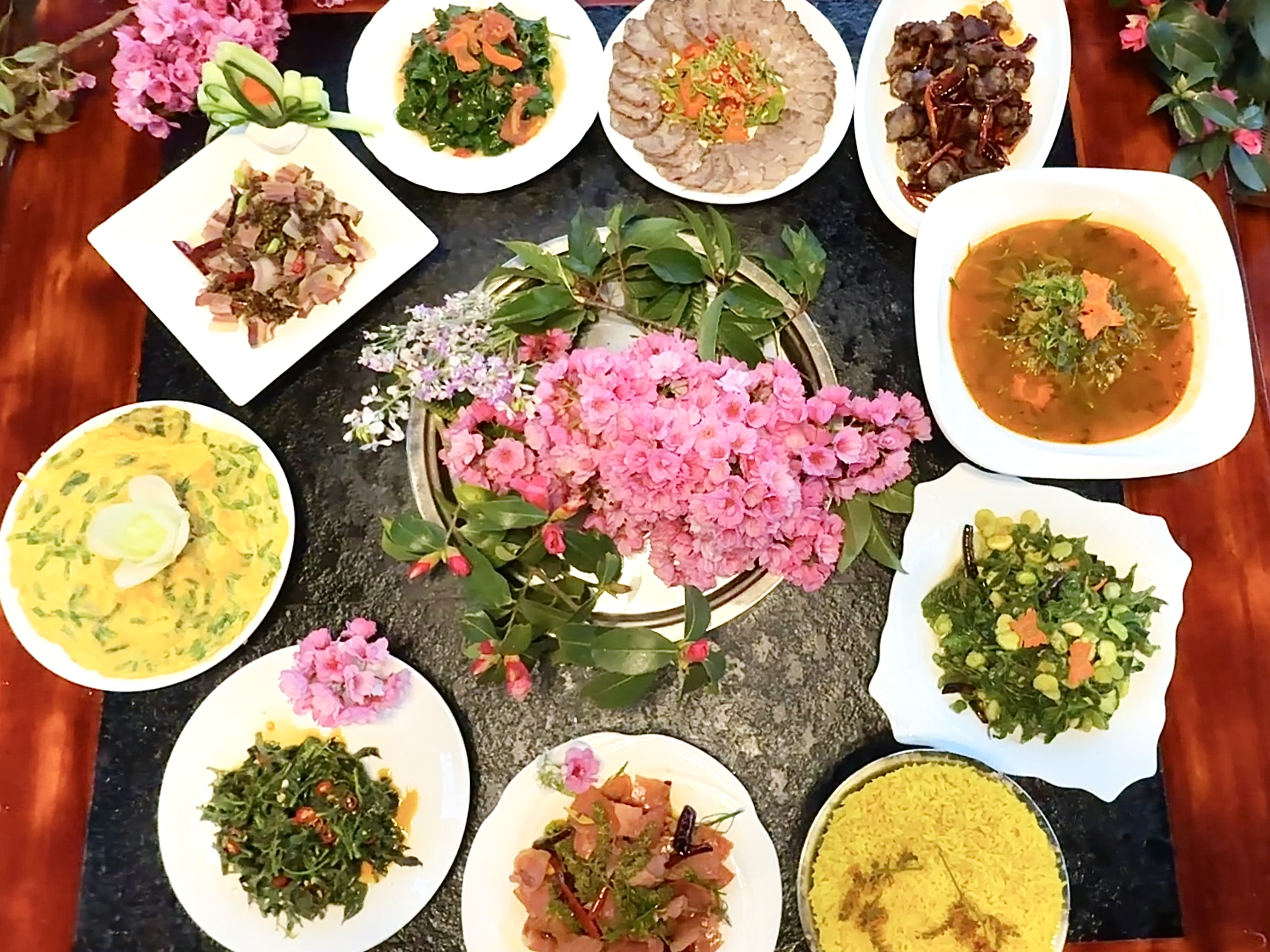 当地人背起竹篓上山采摘:“棠梨花要配腊肉炒,核桃花焯水才不涩喉。”楚雄的春天,从舌尖漫出的新鲜野味开始。向阳坡上的棠梨树缀满雪色花苞,嫩粉色的报春花藏在茶园里,像洒落山间的星星,核桃花细长的身姿在阳光下泛着翡翠的光泽。忽有山风过境,樱花、棠梨花、桃花簌簌落在茶园里,沾着花香的,混着晨露的,每一片都写着不同的春讯。