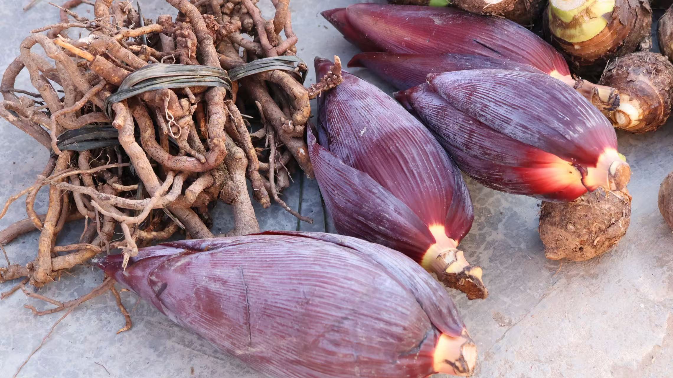 软糯丰腴的芭蕉花。紫红的花苞层层剥开,嫩黄的花心才是精华。清水漂洗,加盐揉搓去涩,与腊肉一同翻炒,油脂渗进花丝,口感丰富。若炖一锅腊排骨,再放入芭蕉花,汤汁浓稠,花香与肉香交融,是最实在的下饭神器。