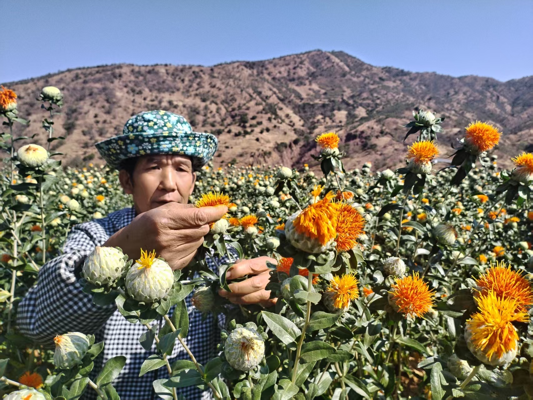 春染金沙江,风拂傣乡田。走进云南省楚雄彝族自治州永仁县永兴傣族乡,3800余亩滇红花正值盛花期,连绵的山坡上橘红色的繁花恣意绽放,宛如绚丽云霞铺满大地。田间地头,农民指尖翻飞、小心翼翼地捻收红花,欢声笑语随风飘荡——这抹耀眼嫣红,既绘就别样“春收图”,更以产业之力托起百姓的红火日子,在乡村振兴画卷上写下温暖注脚。