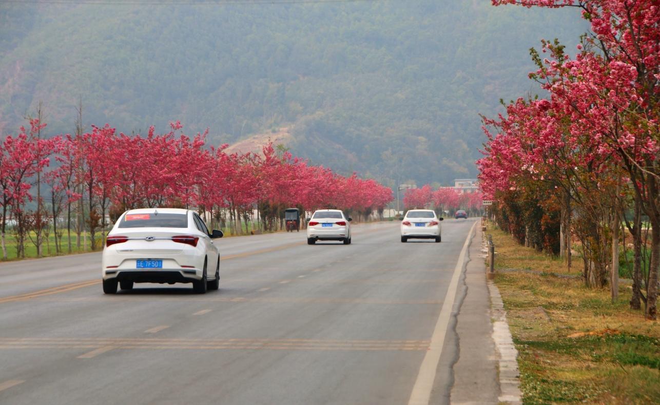 樱上繁花盛,樱下游人织。谁能想到,如今声名远扬的樱花公路,多年前只是南华县众多普通通行道路中的一条。2024年,南华县探索出了“绿美公路+美景”建设模式,因地制宜,在南永公路南华段精心种植樱花树2114棵、银杏树589棵、石楠1909棵、金竹1211棵、柏树381棵,匠心打造出春赏繁花、夏游竹林、秋看银杏、冬观松针的特色绿美公路。