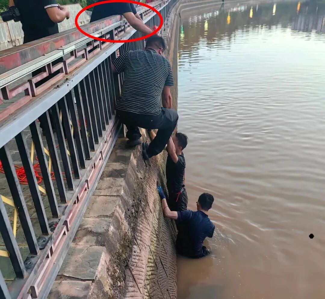 余红李(左上第二个)和战友在河水中翻找涉案手机